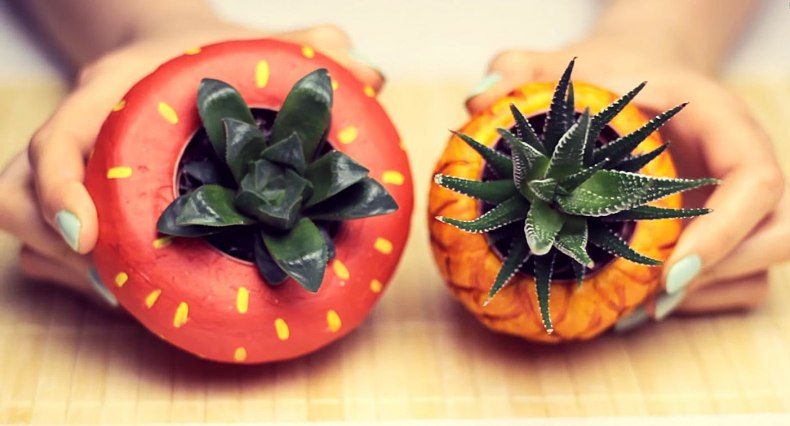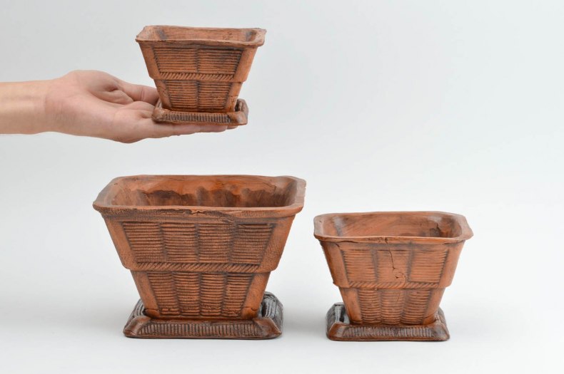 Для декорирования можно приобрести обычные, ничем не примечательные глиняные горшки, но лучше взять старое и скучное домашнее кашпо.