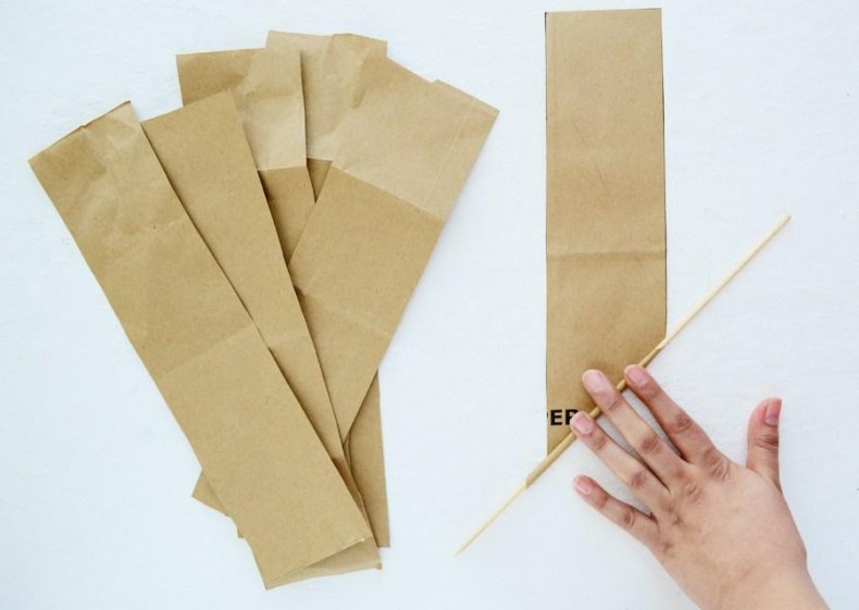На угол бумажной полоски укладываем шпажку. После чего наматываем всю площадь детали в виде диагональных витков. В результате получаются бумажные трубочки, кончики которых фиксируют клеем.
