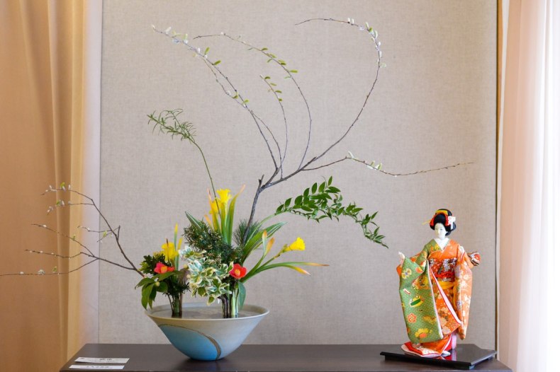 - В пустующем углу, над ветвями или посреди композиции располагается цветущий фокус притяжения;