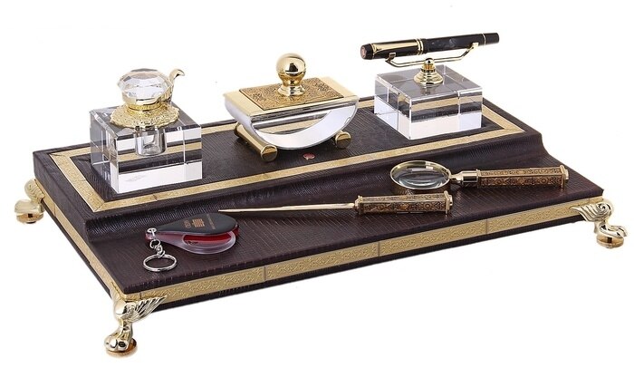 - настольные принадлежности – пресс-папье, подставка для ручек и карандашей из натурального камня;