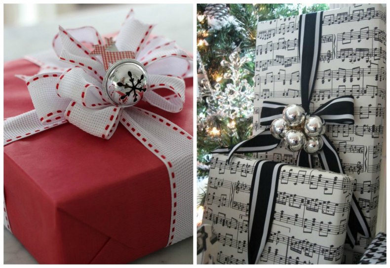 Вам понадобятся и подарки, и ножницы, и изолента, и лента, и оберточная бумага с рождественским мотивом или любым другим, и другой монохромный или целлофановый.