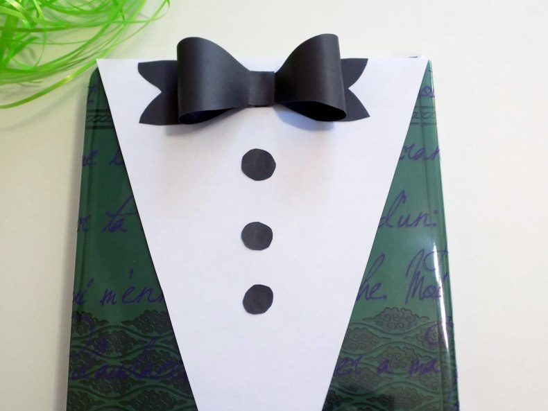 - Вы можете либо приклеить его к упаковке, либо при складывании бумаги вставить ленту между складками и использовать ее для завязывания воротника — но вам все равно придется закрепить его липкой лентой или термофеном — а если у вас есть горячий пистолет, можно наклеить пуговицы на ножку.