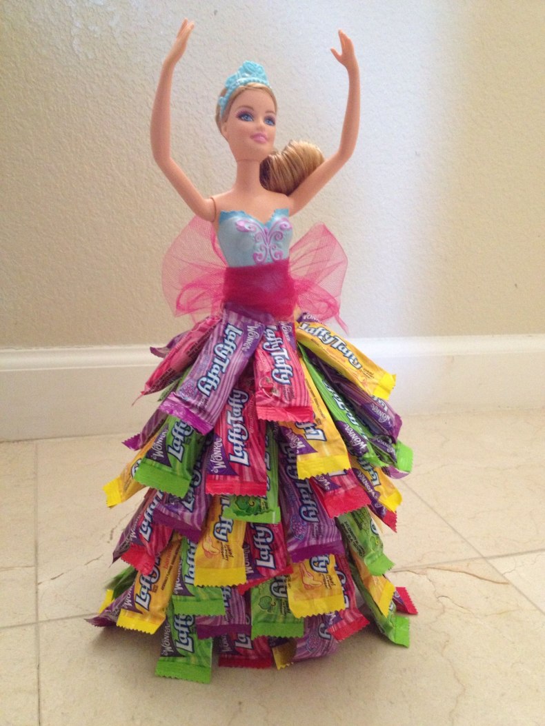- Украсьте платье: как и при изготовлении конфетного букета, сверните цветы, прикрепите к зубочисткам и закрепите на юбку куклы. Можно обернуть некоторые элементы вырезанными кусочками органзы, чтобы избежать просветов и придать наряду пышность. Начните снизу, с пенопластовой основы, и продвигайтесь, заполняя всё пространство конфетами в шахматном порядке.