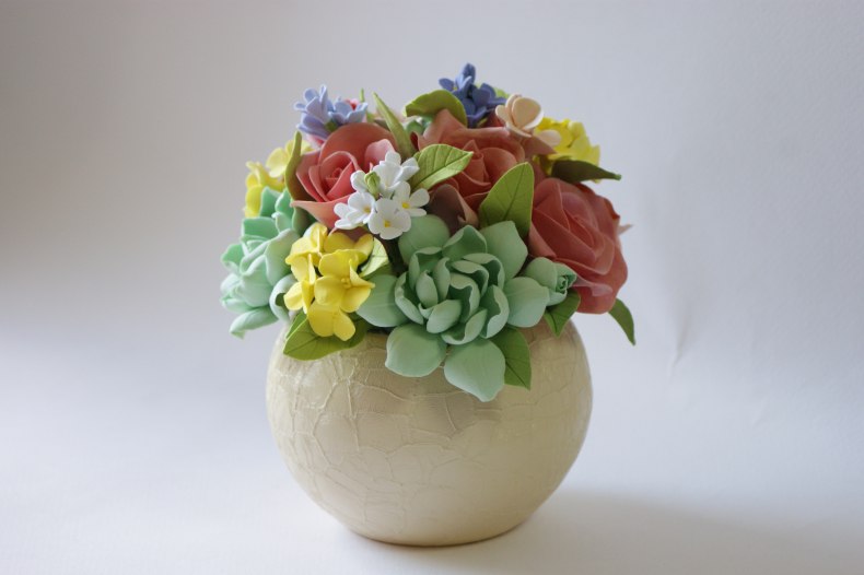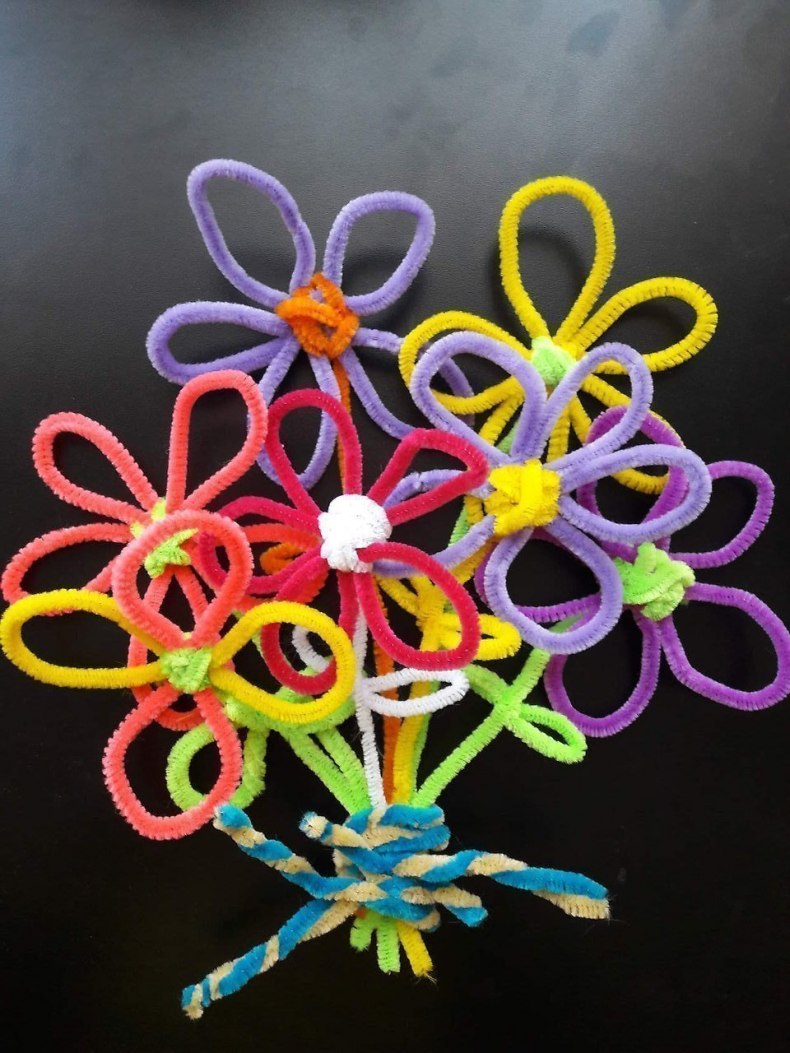 Каждый цветок из мармелада оборачивается пищевой пленкой и потом оформляется красивый букет. Для более взрослой дочери букет можно сделать из гофрированной бумаги, где в каждый бумажный цветок вставляется любимая конфета дочери. Конфеты можно съесть, а букет останется на память.