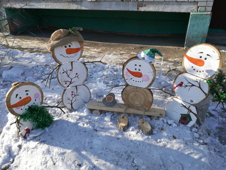 Во дворе или в саду можно разместить снеговика, собранного из деревянных пенёчков или чурок, подобрав их по размеру, придав округлую форму и покрасив. Собрать сказочного героя можно из камней.