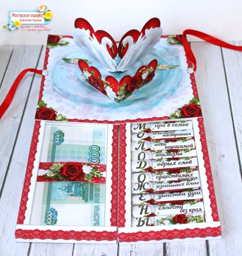 - Универсальным подарком на свадебное торжество являются денежные купюры. Проявив фантазию можно красиво преподнести такой подарок. Можно уложить деньги в стеклянную банку необычной формы, а можно поместить купюры в мешочек.